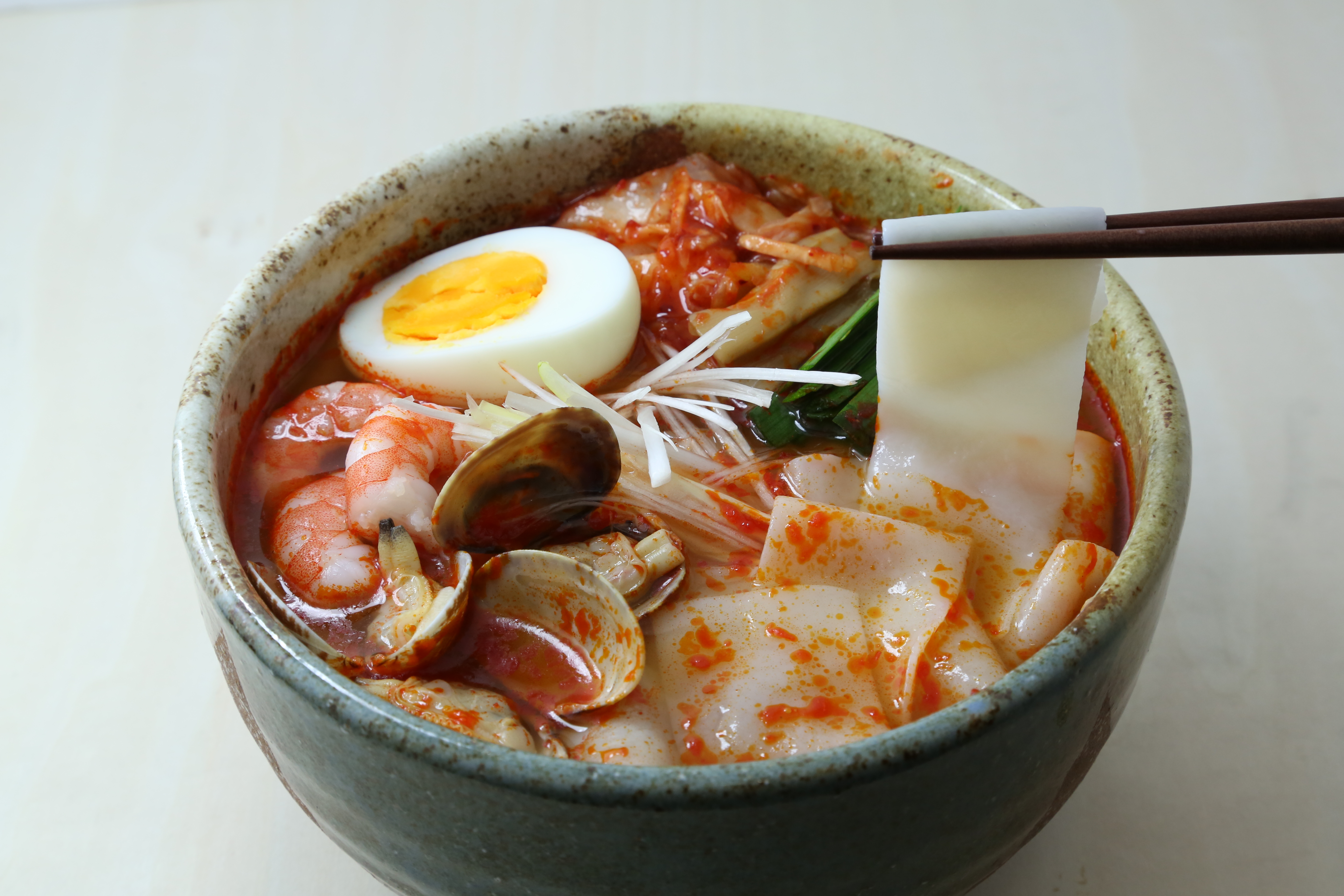 ピリ辛スープが食欲をそそる一杯。魚介と野菜の旨みが広がる、満足感たっぷりのアレンジです。